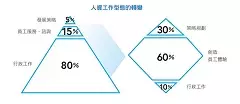 因為AI、自動化,人資部門的工作型態也發生了改變,原本需要花大量時間完成的行政事務,例如:篩選履歷、反覆教育訓練等交由機器人分憂解勞,HR的工作價值從行政轉型為顧問、策略規劃,工作的重心及型態也與先前截然不同。俞莉蓁解釋道,「過去人資的工作型態就像是三角形,最多的80%時間投入基本的面試、算薪水等行政工作、15%時間為員工服務與提供諮詢,只有5%的時間能投入員工服務及人資發展策略;數位轉型後,HR同仁更需要與員工互動,設計讓員工滿意的工作體驗,所以現在與未來的人資工作型態會變成鑽石形─10%行政工作、60%創造員工體驗、30%策略規劃。」