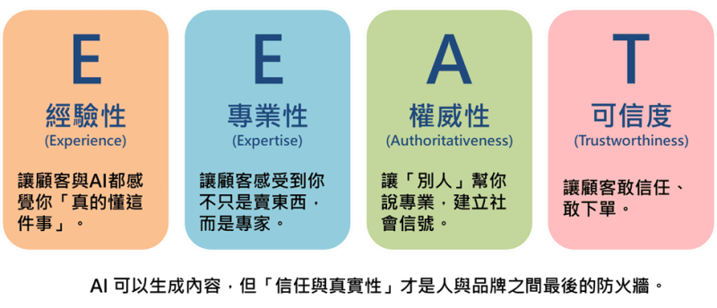 網路文案內容要取得AI的關注,有很多面向,其中一個較具體且關鍵性的方向,是Google在2022年強化E-A-T(Expertise、Authoritativeness、Trustworthiness)框架,並在2023年加入新元素「Experience」,形成了新的E-E-A-T準則,它不只是評估網站品質的指標,更是AI時代的內容信任機制,未來誰能在E-E-A-T上取得優勢,誰就能被AI模型引用、被演算法推薦,成為「可信賴的知識來源」,換句話說,E-E-A-T,將是AI時代SEO的靈魂。