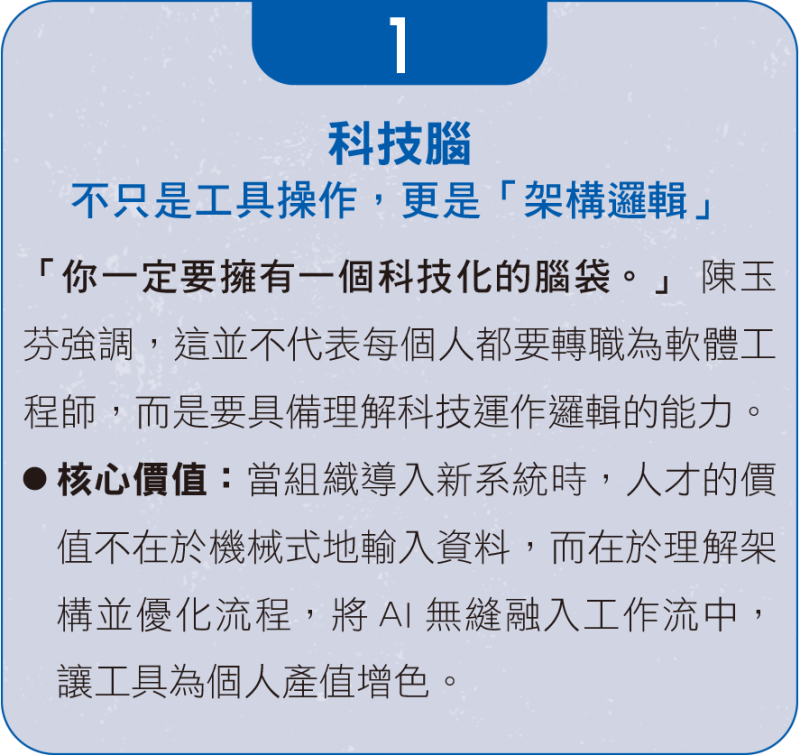 陳玉芬以招募顧問為例,其價值已從單純的媒合面談,轉向深層的組織研究與顧問服務,協助企業解構未來的人才布局。這意謂著「指令工程」(Prompting) 將不再是工程師的專利,而是各行各業與AI協作的通用語言。在「技能導向