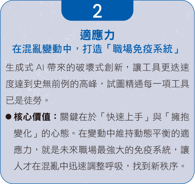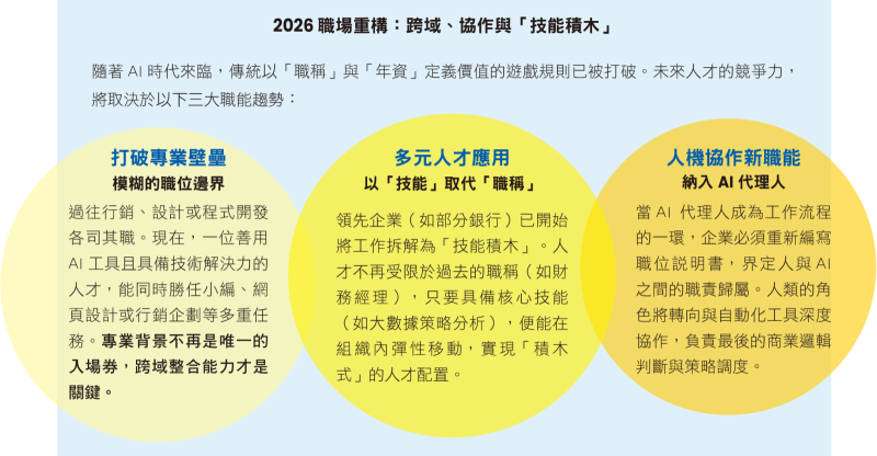 當「職稱」與「年資」的權重降低,取而代之的是能夠跨越領域、解決複雜問題的「職能組合」。企業不應再追求囤積人力,而應追求技能的動態對齊,才能在AI浪潮下重塑競爭力。