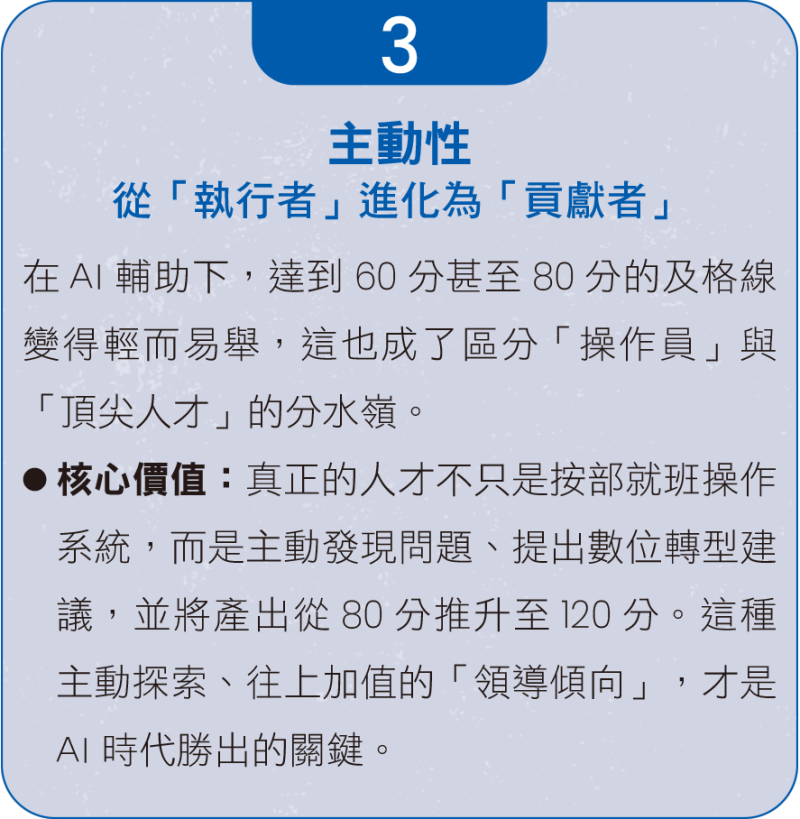 當在AI代理人 (AI Agent) 步入職場的時代,傳統以Excel報表或文書產出為核心的競爭優勢已不復存在。人才的價值評估標準正在發生重大偏移,重複性行政工作被AI接管,「觀點」與「洞察力」才是人類不可取代的核心技能。