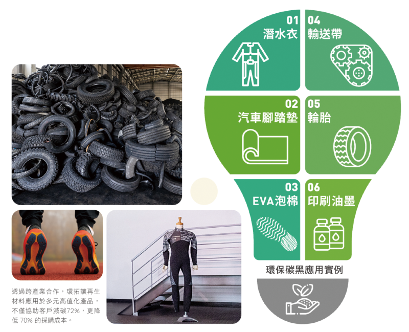 以全球潛水衣龍頭薛長興工業的合作為例,導入環拓的環保碳黑,經數據驗證能比原生碳黑降低72%的碳足跡;更關鍵的是,在材料採購上能協助客戶降低70%的成本。這意謂著客戶只需支付原生材料約三成的價格,就能獲得同等的工業性能與完整的ESG效益。